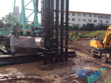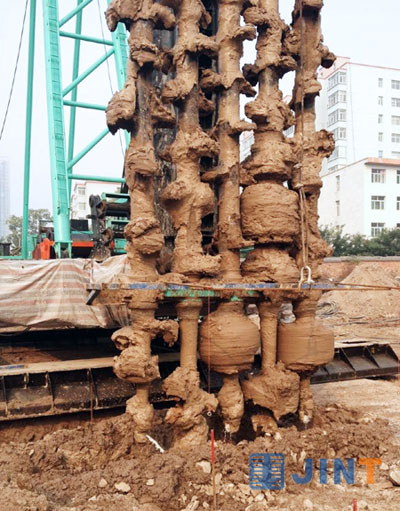 其次,使用ZKD85-5可大大降低水灰比的同時(shí)解決了水泥漿外溢造成的浪費(fèi)。三軸鉆機(jī)采用螺旋葉片,下鉆時(shí)葉片的負(fù)載較大,只能通過(guò)增大水灰比來(lái)降低負(fù)載。通常,三軸鉆機(jī)攪拌施工時(shí)的水灰比為1.5-2.0,水泥用量高達(dá)到20%,而實(shí)際有效用量只有13%左右,容易造成水泥漿外溢和浪費(fèi)。ZKD85-5施工時(shí)水灰比降為0.8,而且水泥能全部攪拌在土層中,施工成本明顯降低,同時(shí)還解決了水泥漿污染、外運(yùn)的煩惱。此外,鉆頭的改進(jìn)有效增強(qiáng)了設(shè)備入土切削的能力。