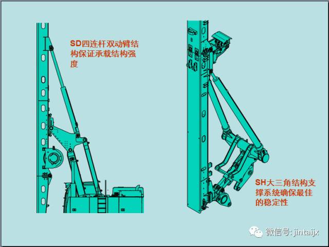 7)在原有SD32基礎上,對四連桿結構及油缸液壓系統(tǒng)的設計進行了全面升級,油缸起塔能力大幅度提升;