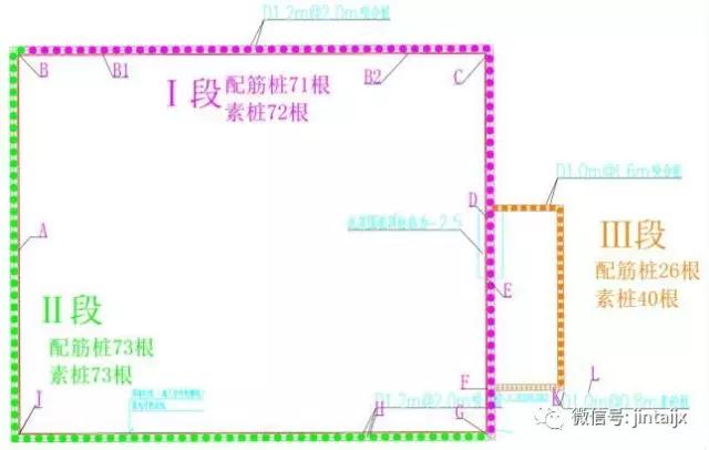 地勘報告揭示,場地內地層主要由人工填土層、有機質黏土、礫質黏性土和粗?;◢弾r等巖化物質組成。工程基坑支護采用一種新型的咬合灌注樁方式,其中直徑1.2m咬合樁289根,直徑1m咬合樁66根,基坑支護咬合樁共計355根。(具體樁型及分布如下圖所示)