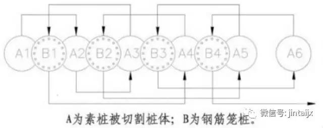全套管咬合樁施工的跳樁方式并不是簡單的“進一退一”漸進模式,而是采取連續(xù)跳樁方式,這樣可以合理利用素砼的緩凝時間,在保證成樁質量的同時,又能提高施工效率。一般情況下,全套管鉆進連續(xù)跳樁的施工順序為A1→A2→A3→B1→A4→B2→A5→B3→A6→B4……(如下圖所示)。