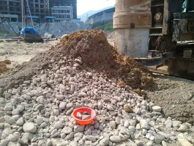 地勘報(bào)告顯示,素填土層中底部有較早拋填的大塊花崗巖,粒徑在0.5~2.0mm不等。除此之外,在②-2的卵石層的卵石密度達(dá)到密實(shí)級(jí),含量50~60%,一般粒徑為20~100mm,最大達(dá)400mm,亞圓形為主,分選性較差,質(zhì)地堅(jiān)硬,母巖成分為凝灰?guī)r、花崗巖等,中~微風(fēng)化為主,充填物為砂礫及粘性土,無(wú)膠結(jié),鉆探中孔壁易塌。