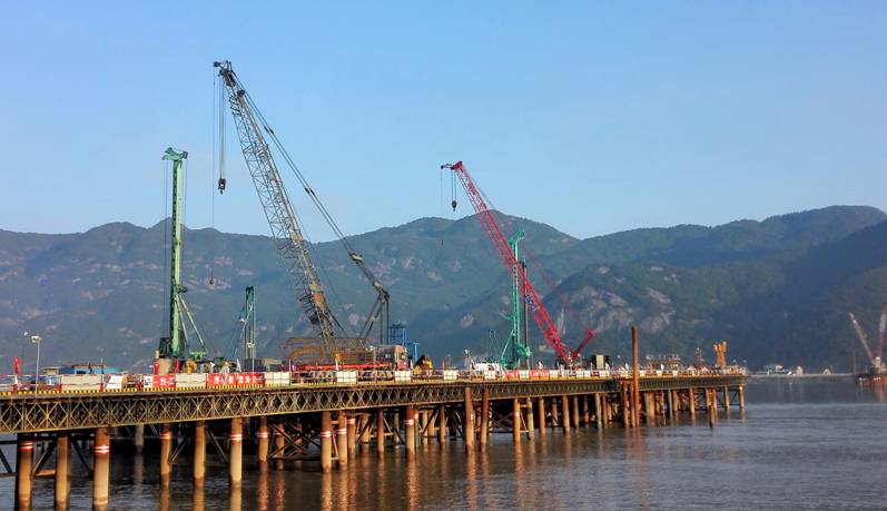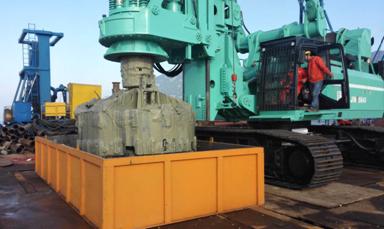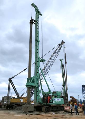 工程現(xiàn)場負責人上海廣聯(lián)環(huán)境巖土工程股份有限公司項目經理張輝介紹,該工程的地質條件和工況環(huán)境十分特殊,在實際施工中需下放直徑2.8米、42米長的鋼護筒,護筒深入水下土層達38米深。為保證成孔質量和施工效率,上海廣聯(lián)選用了金泰的SH46型大扭矩旋挖鉆機施工。
