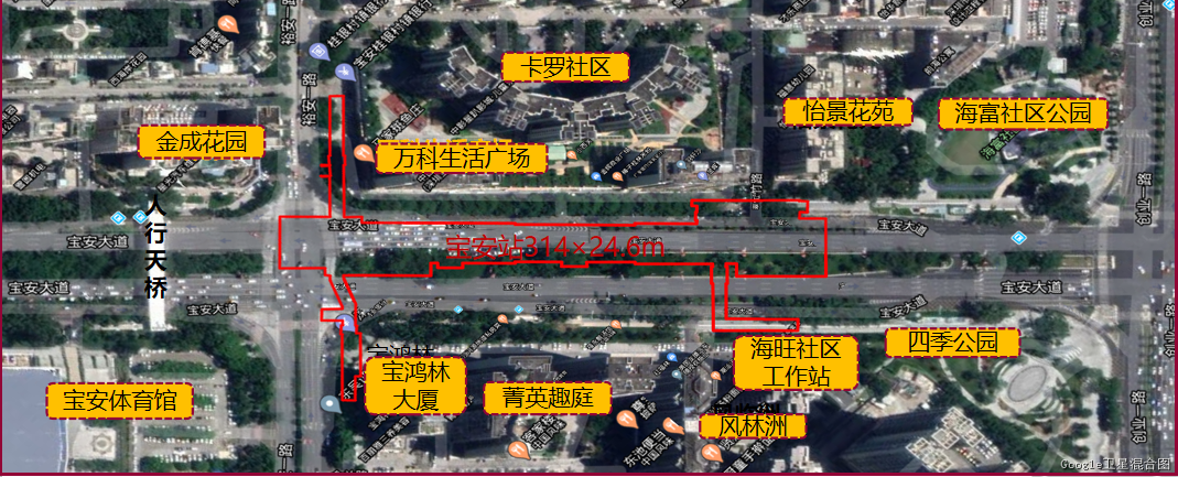 SX50在建施工的寶安站位于寶安大道上,處于裕安一路與創(chuàng)業(yè)一路之間,為穗莞深城際深圳寶安至前海段的第二座車站。該車站規(guī)模314m(長)×25.1m(寬),基坑開挖深度為30.5~32.87m,地下三層雙柱三跨島式車站,明挖順作法施工,附屬設(shè)4個出入口,2組風亭。周邊建筑密布,沿線主干道兩側(cè)分布有地下通訊管線、電纜、燃氣氣管道、給排水管等各種類型的地下管道及線路,埋藏情況較為復(fù)雜。