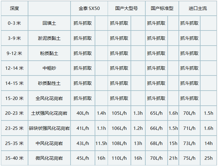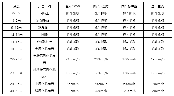 本工程采用抓、銑相結(jié)合施工工藝。全風化以上地層用金泰SG70液壓連續(xù)墻抓斗進行施工。巖石段采用雙輪銑進行銑削施工,該工程現(xiàn)場有多臺雙輪銑在同一個地段進行施工。金泰SX50雙輪銑、某進口主流雙輪銑、某國產(chǎn)大型號雙輪銑和標準型雙輪銑。