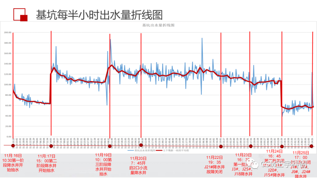 坑內(nèi)外水位曲線匯總圖基坑每半小時(shí)出水量折線圖