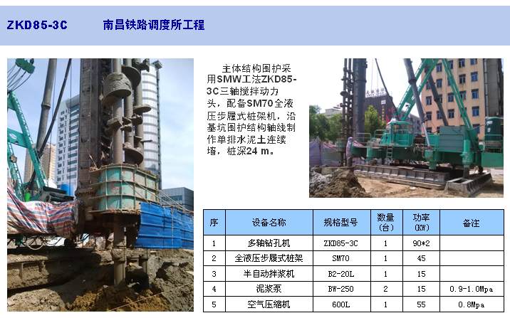 ZKD85-3C三軸鉆孔機是使用SMW工法加固軟土地基的施工設(shè)備,適合在城市高層建筑、地鐵車站和地下室的擋土、防滲連續(xù)墻施工以及在江河堤壩、水利工程施工中進行防滲及軟土地基加固等。